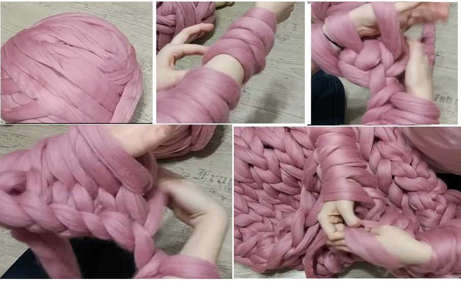 Для начинающих доступно вязание пледов руками из толстой пряжи. Их толщина требует очень толстые спицы, которые сложно найти, поэтому вместо них используют свои руки. Петли формируют на них. Дальнейший порядок обычный: начальный набор по ширине, вывязывание петель и выполнение разных схем.