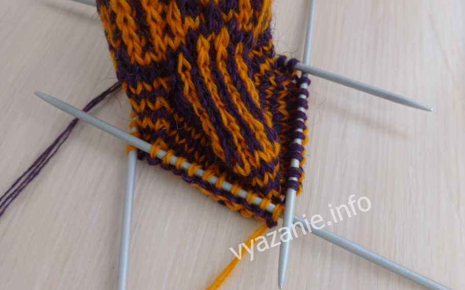 Затем 1 ряд фиолетовым цветом. Второй фиолетовый ряд вяжем не полностью. Последние 11 петель вяжем уже жёлтой нитью в обратную сторону. Чтобы пятка стала полосатой, будем вязать туда-обратно одним цветом, потом менять цвет. 1 петлю вяжем, вторую — снимаем. Если вяжем жёлтой нитью, то фиолетовые петли переснимаем. Когда вяжем фиолетовой нитью, переснимаем жёлтые петли. Пятка стягивается, укрепляясь. Провязали 18 рядов. В лицевом ряду набираем из кромочных по 9 петель. Переходим на спицы №2,5.