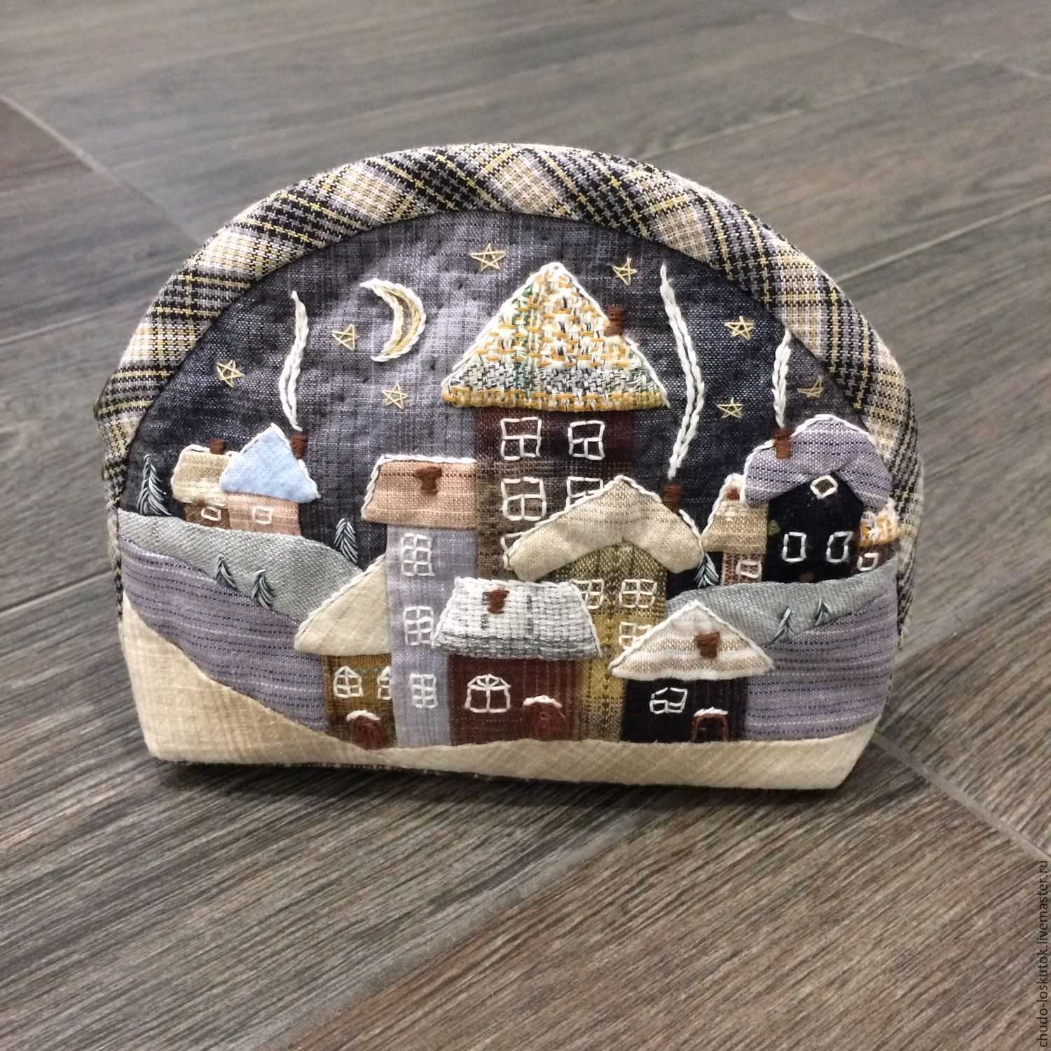 - Сшейте вручную, используя шов «вперед иголку» и нитки мулине, детали косметички и пришейте фрагменты аппликации. Пришейте молнию.