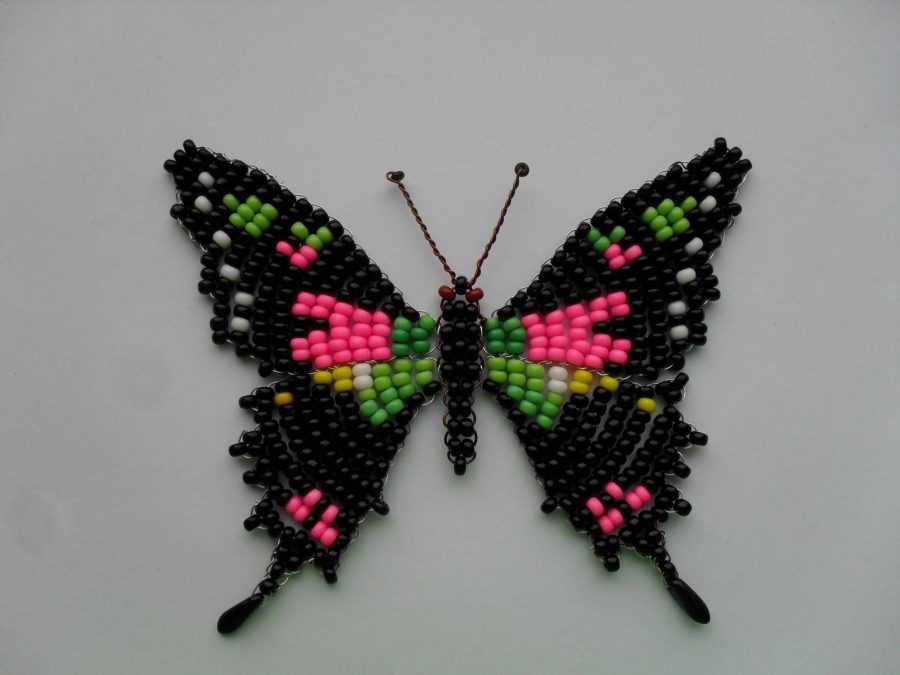 По той же схеме плетется второй большое крыло, так же точно закрепляется на теле бабочки. Закручиваем усики покрепче – и бабочка из бисера своими руками готова!