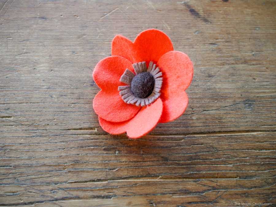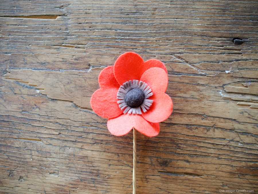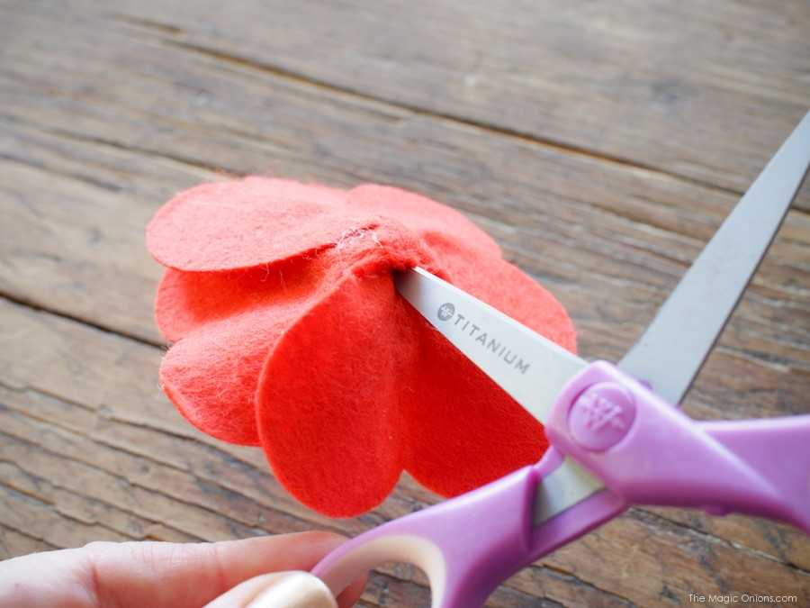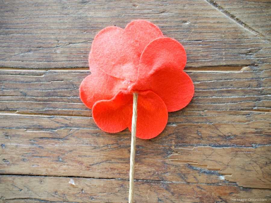 - Из контрастного оттенка фетра вырезаем небольшой кружок, собираем его в небольшой шарик и приклеиваем в сердцевину. Цветок готов.