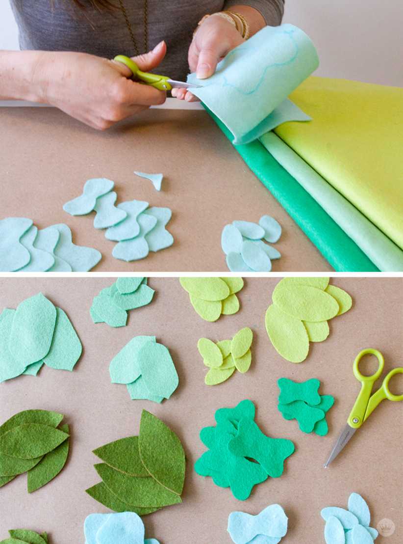 Шаг 2. Выкройки приколоть к фетру каждую к своему цвету и вырезать нужное количество деталей.