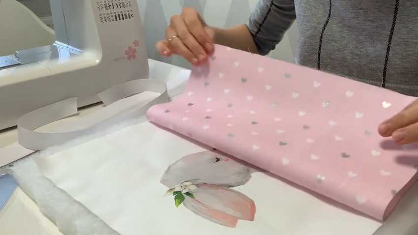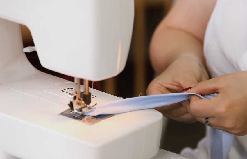 Затем стоит сделать завязки для бортика, завернув 1 см подготовленной ткани с каждой из трех сторон, сложив отрез пополам лицевой стороной внутрь и прострочив по всей длине. Далее прошейте короткие участки ленты. |
