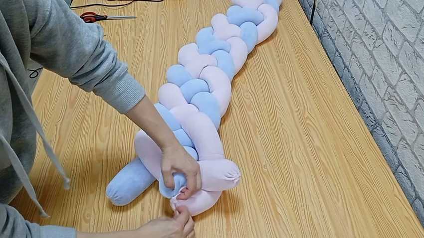 Полностью доплетите косу и скрепите концы деталей ручной строчкой. |