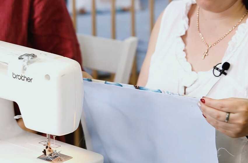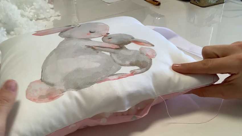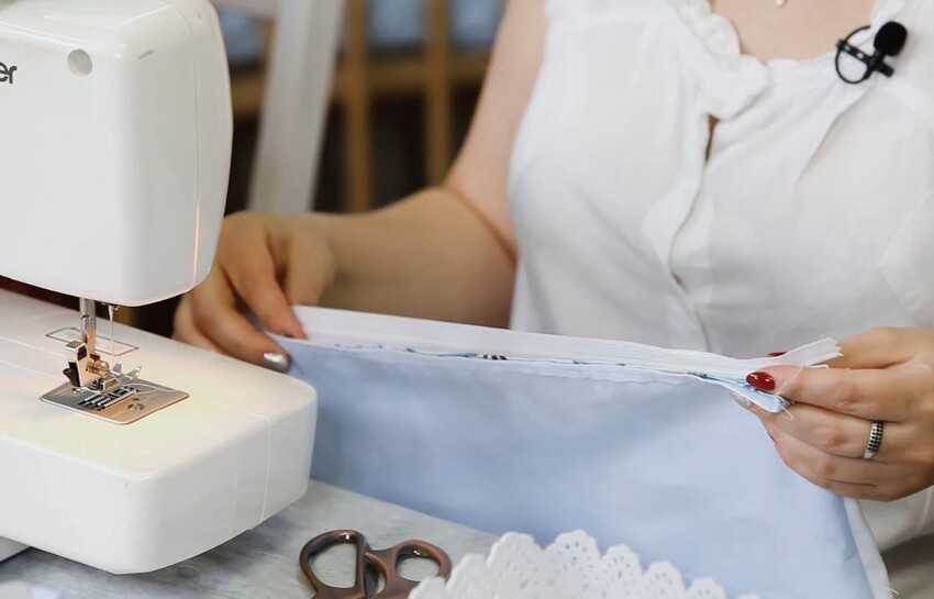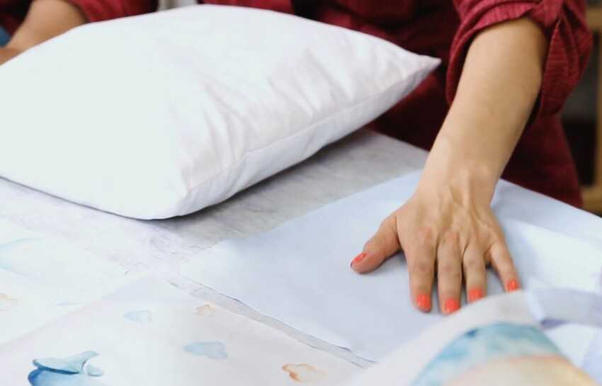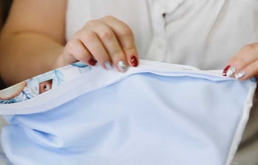 Вденьте белую нитку в иголку, поместите руку внутрь изделия, приложите простроченную ленту, сложенную пополам, и пришейте ее вручную прямыми стежками. То же самое проделайте с другой завязкой, пришив ее к противоположной стороне наволочки. |
