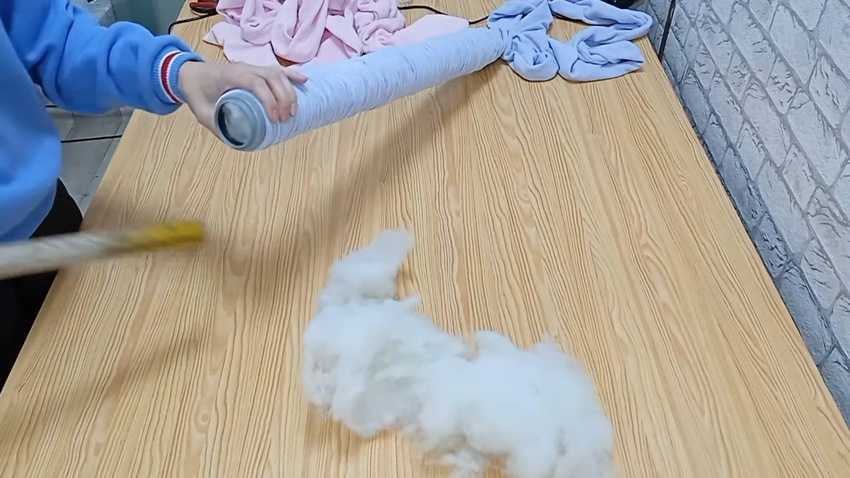 Выверните детали и приступите к набивке, используя пластиковую трубу. Для этого наденьте на нее одну из полос и поместите наполнитель внутрь. |