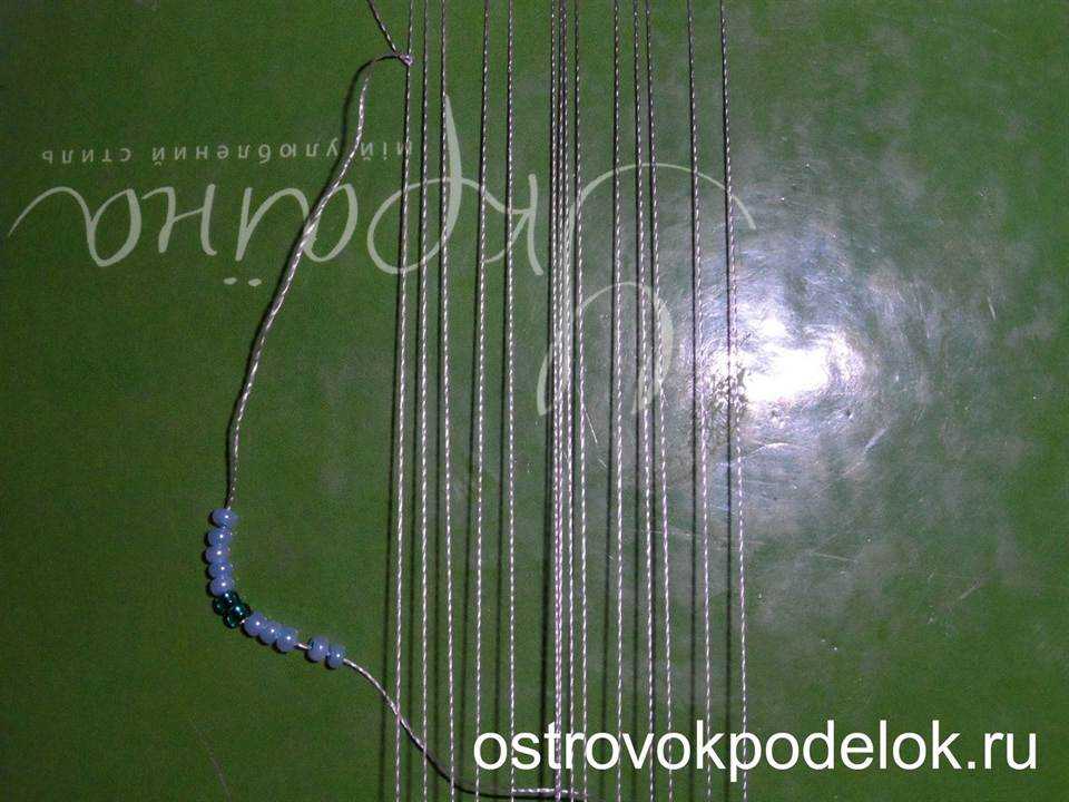 С одной из сторон под нити нужно что-нибудь подложить, чтобы было удобнее работать. Далее отрезать нить длиной 1,5-2 метра, лучше, если хватит одной нити на все плетение. Закрепить нить к крайней левой ниточке, нанизать бисеринки.