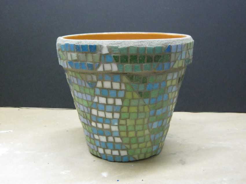 Мозаика на горшкеозаика всегда интересна и может украсить любую поверхность. Цветочный горшок с мозаикой смотрится оригинально. Для выполнения рисунка мозаики можно использовать ракушки, кусочки зеркала, керамики, камушки, стеклышки.