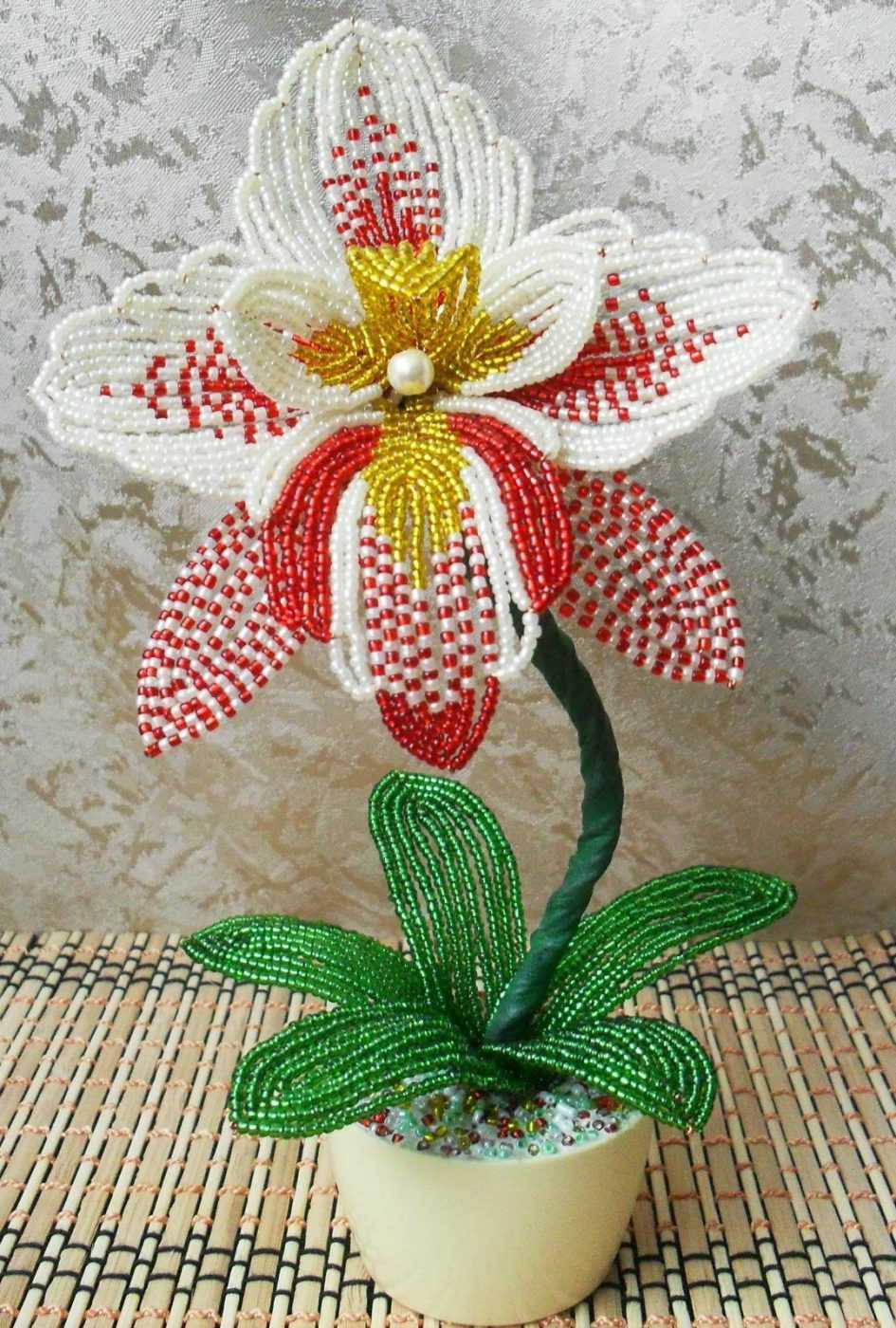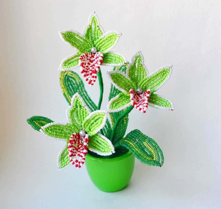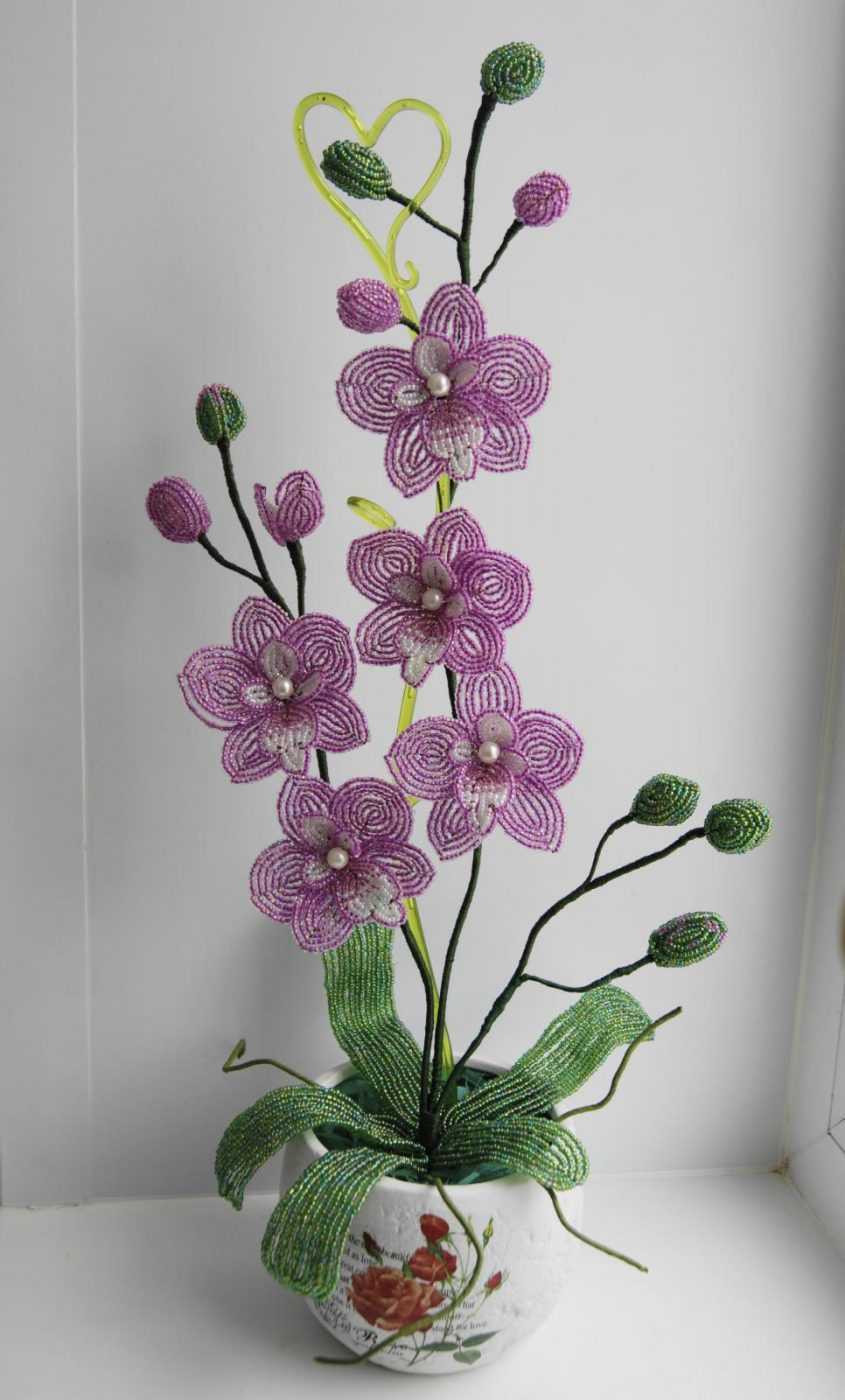 Очаровательная в своей нежности орхидея из бисера готова. Останется только с помощью гипса и соленого теста закрепить ее в красивое кашпо. Такая поделка займет достойное место в любом интерьере.