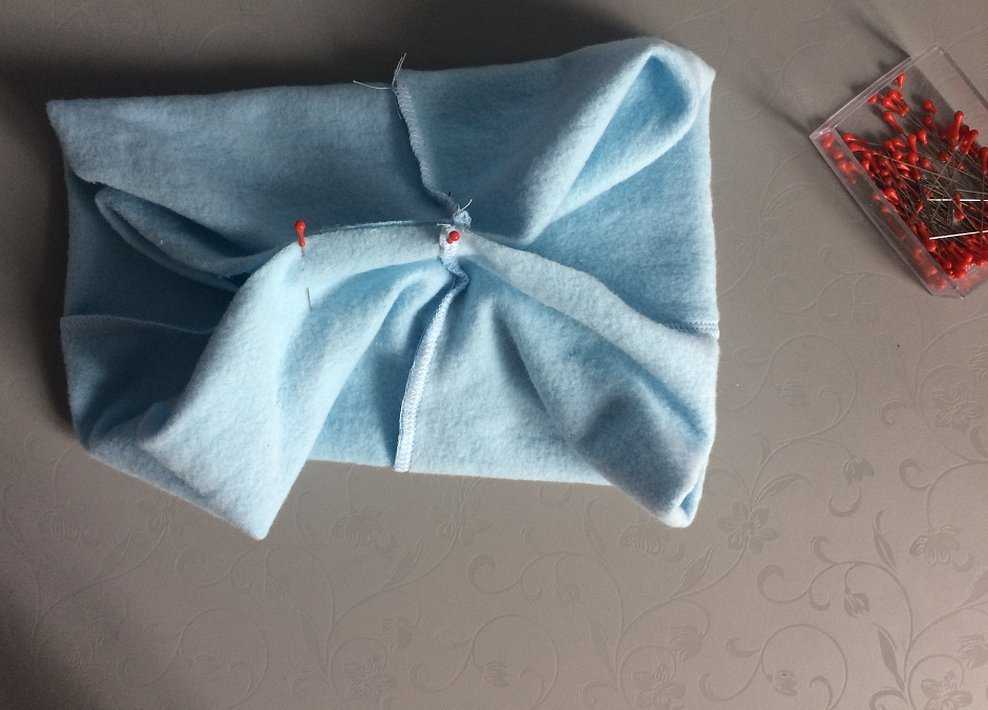 Складываем шапку пополам, расправляем припуски в разные стороны, совмещаем и скалываем иголкой.