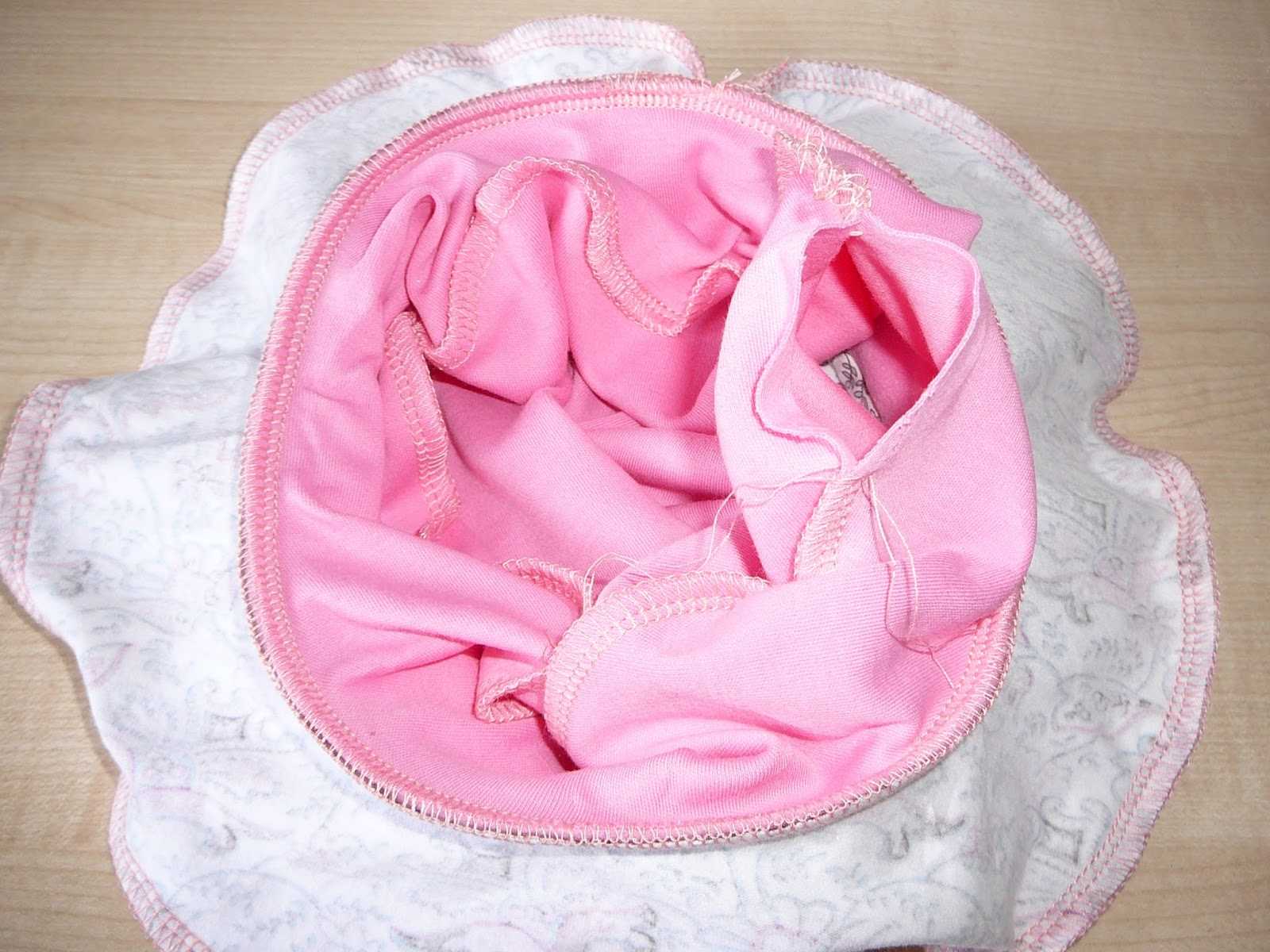 - Сборка шапочки. Внешнюю и подкладочную половинки сложить лицом друг к другу, сколоть иголочками. Пройтись машинной строчкой. Со стороны спины оставить отверстие, примерно 5 – 6 см длиной, для выворачивания.