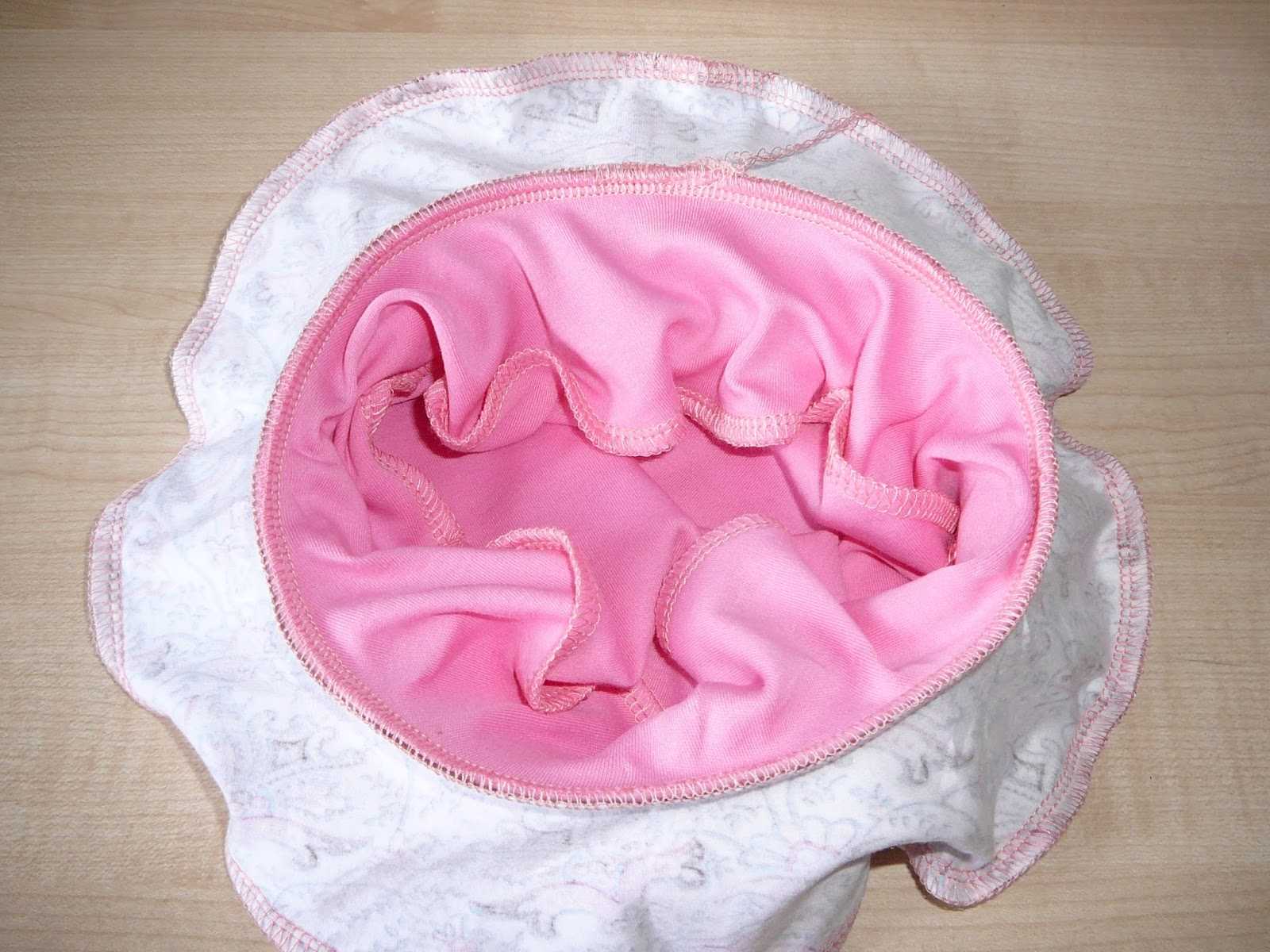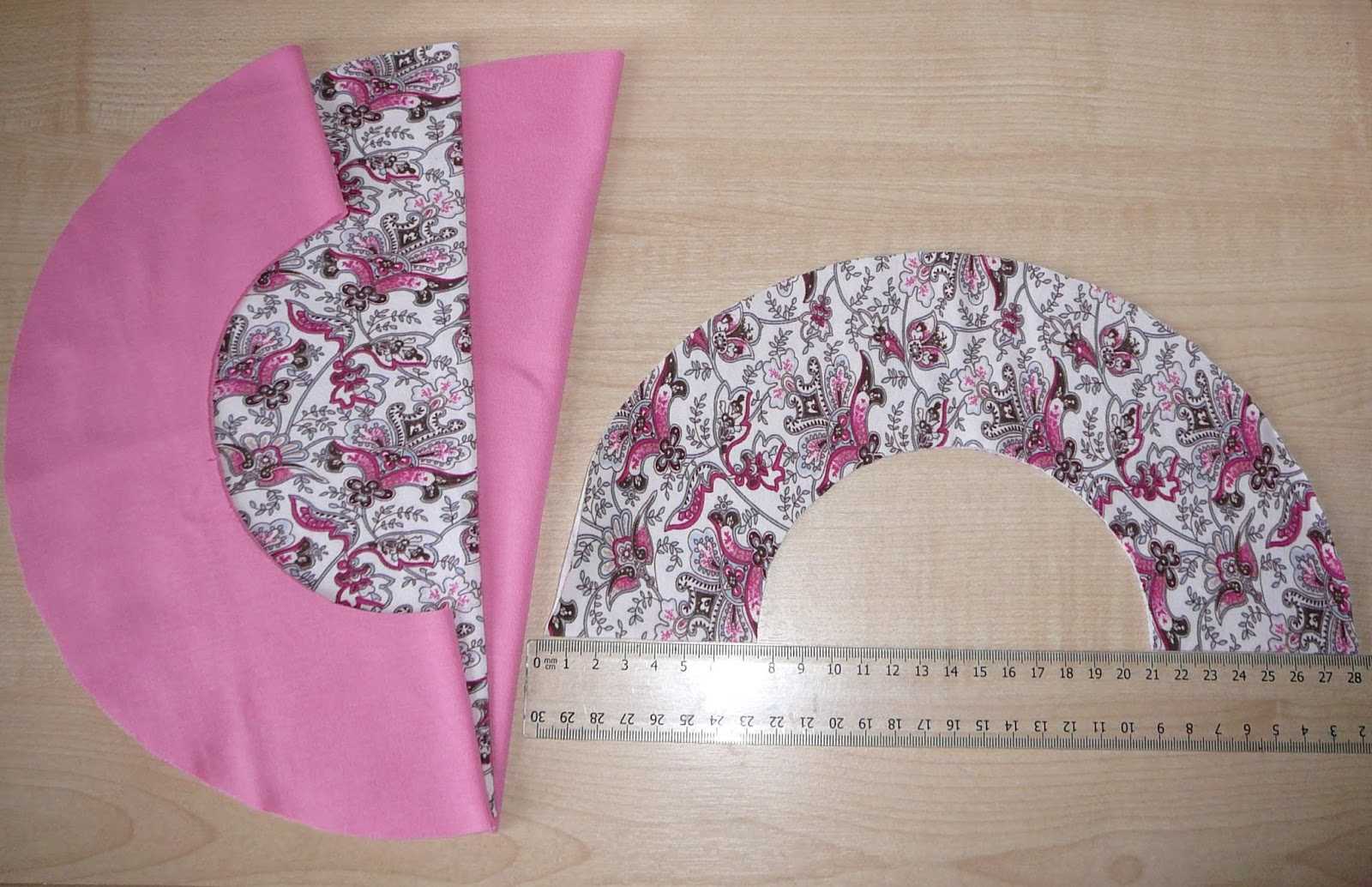 Выбранное полотно складывается пополам и прикладывается к старому детскому головному убору. По нему наводятся контуры и вырезаются детали будущего изделия, делая при этом припуски на швы.