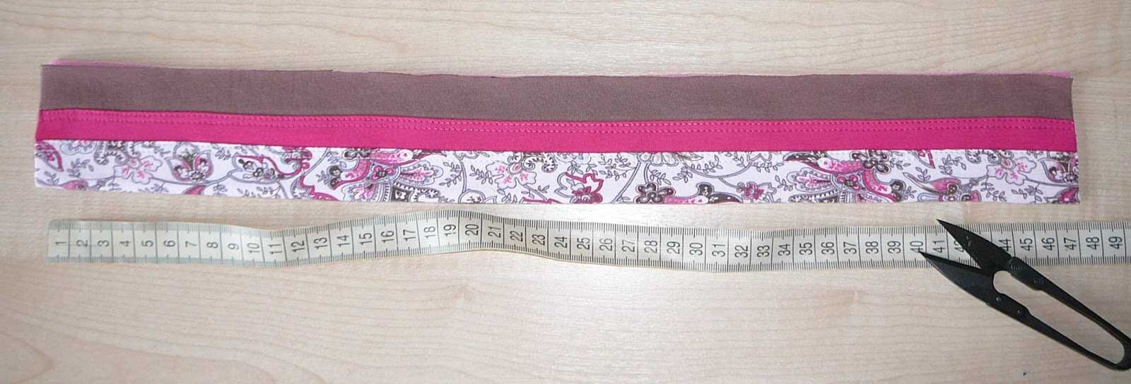 Из тёмного трикотажа вырезаем 2 полоски для завязок. Ширина полосок – 3см. Отрезаем шнур, примерно 19 дюймов (47,5 см). Делим шнур пополам.