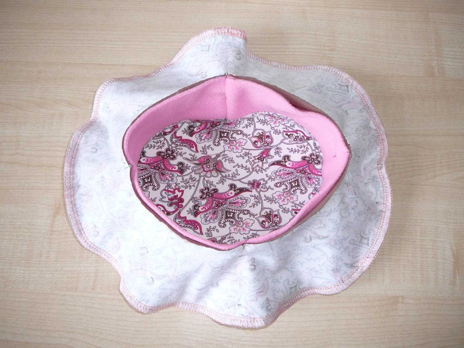 Намечаем мелом или карандашом место завязок. Стачиваем основную и подкладку вместе, вложив завязки. Оставляем немного места, не делаем строчку сплошной, чтобы в дальнейшем вывернуть шапку на лицо.