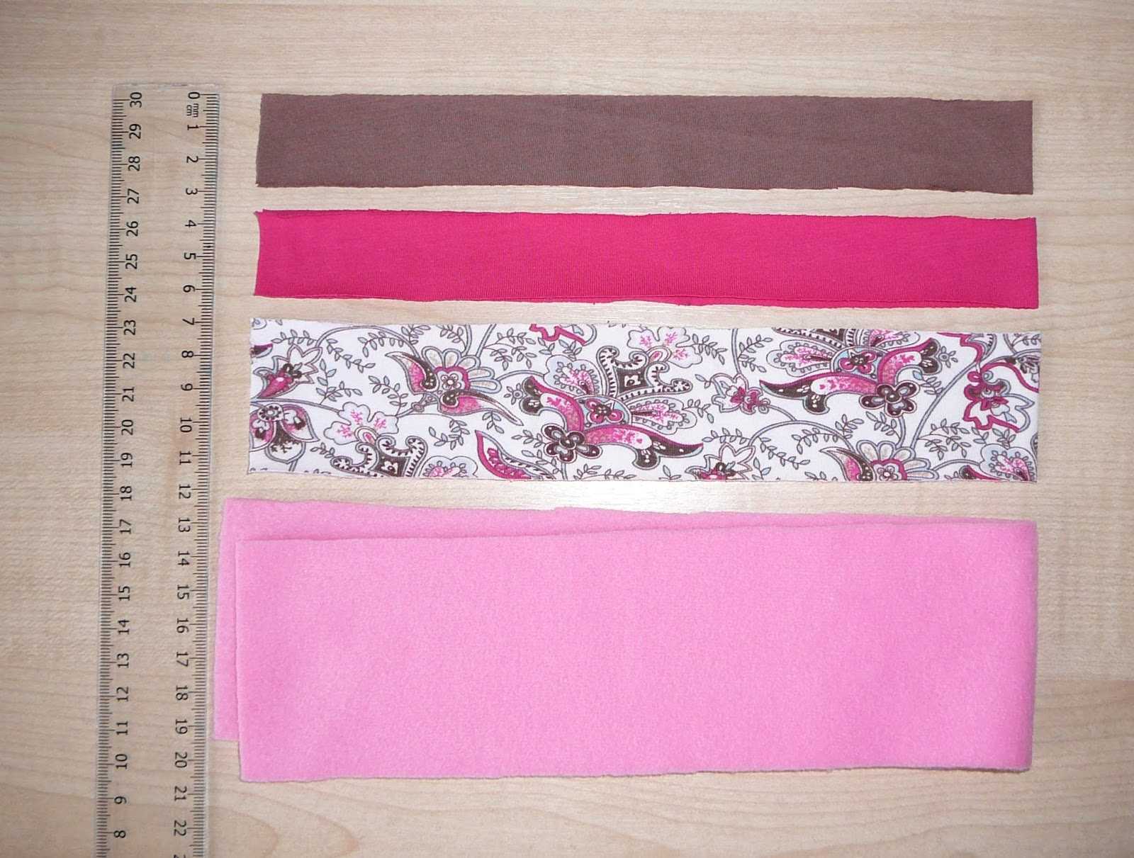 - Приготовить завязки: отрезать полоски, примерно 1 см шириной. Так как флис не сыпется, края можно не обрабатывать. Пришить их несколькими стежками.